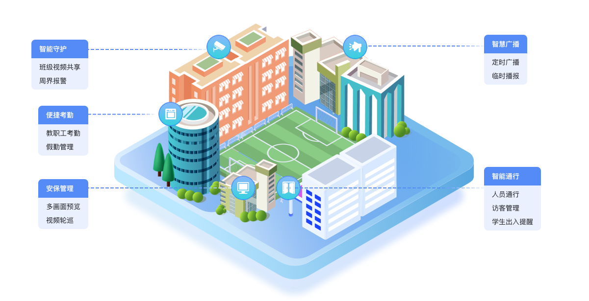 面向中小學、幼兒園等校園場景,提供包括智能視頻、教工考勤、門禁通行、訪客管理、廣播等整套智慧校園解決方案,加強校園安全,實現(xiàn)智慧升級。