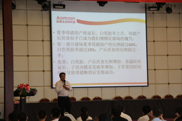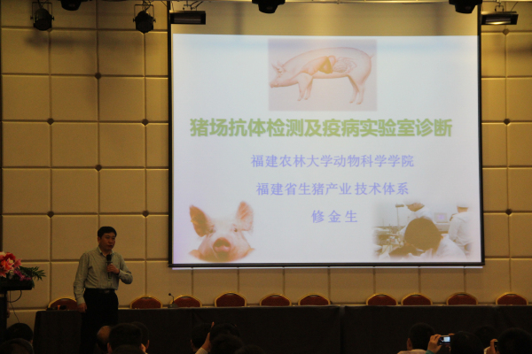 会议的主要内容有:福建农林大学动科院修金生教授为大家带来主题为《猪场抗体检测及疫病实验室诊断》的报告、福建农林大学动科院教授俞道进老师的《换个角度看猪病》、威尔潞威动物保健品有限公司梁彦明董事长带来的《后抗生素时代与益生素》,提倡畜牧行业合理使用抗生素等等。奥姆龙生物工程郭金权博士也精心准备了题为《母猪产程延长的发生机制及处理方案》与在场的畜牧业同行们一起交流学习。