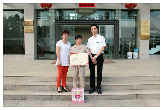 公司董事长林振雁及夫人亲自为游象英颁发贡献奖奖状和纪念品。并送上美好的祝愿。