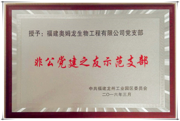 2016年3月30日,中共福建龙州工业园区委员会授予福建奥姆龙生物工程有限公司党支部“非公党建之友示范支部”荣誉称号!