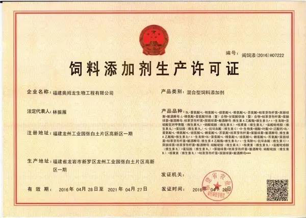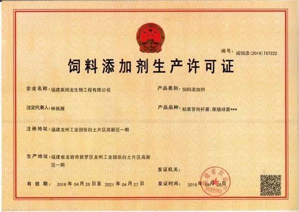 2016年03月19日,福建省农业厅饲料兽药管理处组织相关专家到我公司进行《混合型饲料添加剂生产许可证》、《饲料添加剂生产许可证》现场评审。专家组现场查看了我公司饲料生产车间、饲料化验室、饲料仓储以及相关记录文件,经过专家组成员的全面考核、评审,我司饲料添加剂(枯草芽孢杆菌)顺利通过复验,新建混合型饲料添加剂生产线及新增固态发酵饲料添加剂(乳酸菌)生产线顺利通过验收。
