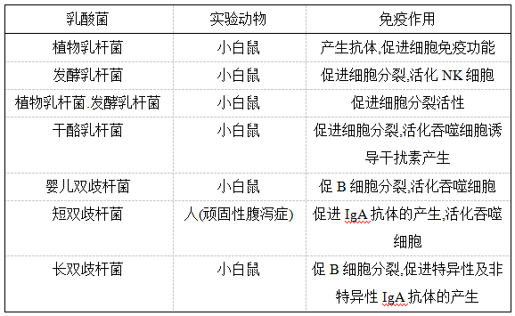 许多研究结果显示:乳酸菌能干预细胞免疫,乳酸菌、双歧杆菌能阻断许多微生物的入侵和粘附(位阻抑制),口服乳酸菌或双歧杆菌能刺激人体产生非特异性免疫。乳酸菌的某些菌株:鼠李糖乳杆菌(ATCC.53103),植物乳杆菌(VTT),乳酸球菌(ARH74),双歧杆菌动物亚种是肿瘤坏死因子α(TNF-α)和IL-6的强有力的诱导剂,有些能刺激IL-10的产生,以增强免疫。干酪乳杆菌和保加利亚乳杆菌可激活巨噬细胞功能,刺激人体产生免疫应答。还通过巨噬细胞和T细胞、NK细胞活性的增强来增强人体的免疫;巨噬细胞、NK细胞、T细胞的活化,有益于增强周围血管和局部淋巴结中淋巴细胞的免疫,T辅助细胞、NK细胞的增加,可使抑制性T细胞减少。吸附于人体的嗜酸乳杆菌具有抗菌活性,该菌株能吸附于分化的肠道细胞上,还可在体外抵抗幽门螺杆菌,杀灭入侵菌。
