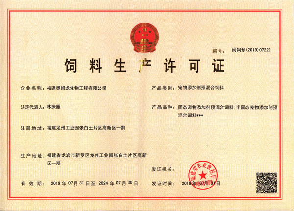 奥姆龙宠物添加剂预混合饲料车间取得生产许可证