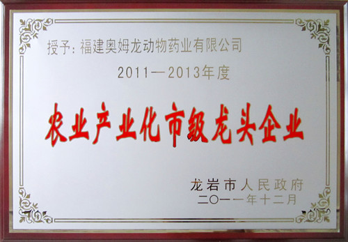 根据《龙岩市农业产业化市级龙头企业认定和资金管理办法》,在各县(市、区)上报,市直部门审核的基础上,经市政府研究,并在《闽西日报》上进行公示,福建奥姆龙动物药业有限公司成为2011年新认定的农业产业化市级龙头企业。