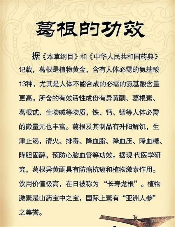 葛根内含12%的黄酮类化合物,如葛根素、大豆黄酮苷、花生素等营养成分,还有蛋白质、氨基酸、糖、和人体必需的铁、钙、铜、硒等矿物质,是老少皆宜的名贵滋补品,有“千年人参”之美誉。早在汉代张仲景的《伤寒论》中就有“葛根汤”这一著名方剂,至今仍是重要的解表方?!侗静菡濉肺礁鸶白钅芸⑵⑽盖逖糁?。