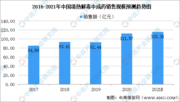 清热解毒为中医名词,清热解毒类药物早己被临床证实确有抗菌的功效,加之其毒副作用较小,被广泛应用于呼吸系统疾病及消化系统疾病的治疗,在临床使用中长期占据着较为重要的地位。数据显示,2019年中国城市零售药店终端中成药清热解毒用药销售额超过92亿元,同比下滑1.03%。预计2021年我国城市零售药店终端中成药清热解毒用药销售额将达115.35亿元。