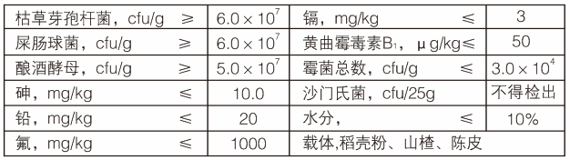 【原料组成】枯草芽孢杆菌、屎肠球菌、酿酒酵母、载体稻壳粉、山楂、陈皮