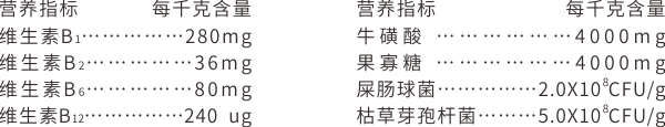 【原料组成】屎肠球菌、枯草芽孢杆菌、复合B族维生素、牛磺酸、果寡糖、纯化水等。