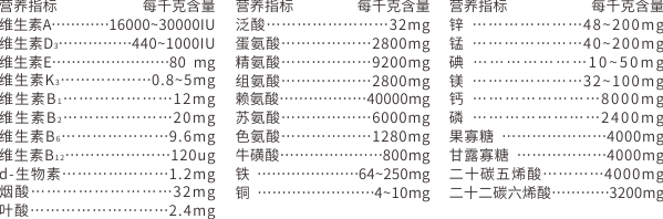 【原料组成】赖氨酸、蛋氨酸、精氨酸、亮氨酸、组氨酸、色氨酸、牛磺酸、鸡肉粉、鱼粉、深海鱼油、椰子油、亚麻籽油、复合维生素、常量矿物质元素、复合微量元素、果寡糖、纯化水等。