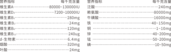 【原料组成】赖氨酸、牛磺酸、复合维生素、复合微量元素、纯化水等。