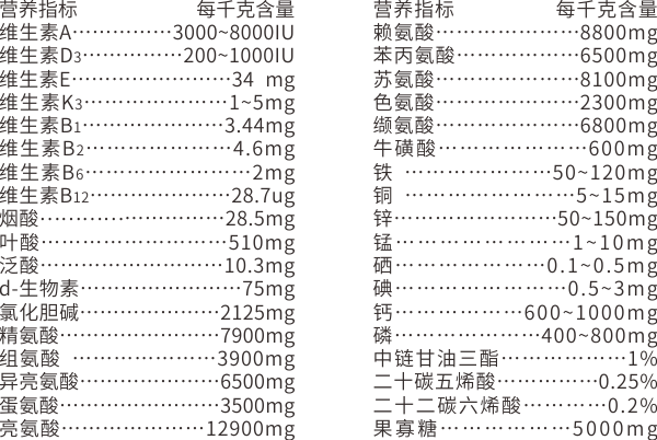 【原料组成 】11种必需氨基酸、?;撬?、甘油三酯(油脂)、Ω-3(亚麻酸+ EPA+ DHA)、复合维生素、复合微量元素、果寡糖、鸡肉粉和奶粉(载体)等。