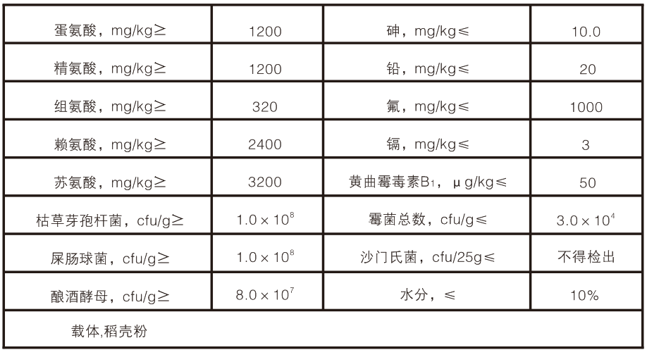【原料组成】蛋氨酸、精氨酸、组氨酸、赖氨酸、苏氨酸、枯草芽孢杆菌、屎肠球菌、酿酒酵母、载体稻壳粉。